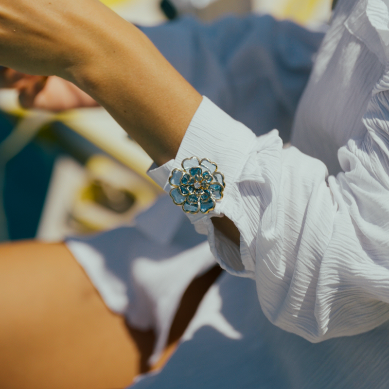 Composée de pétales en nuances de bleu céladon et bordée d’un liseré doré finement travaillé, cette fleur aux accents joailliers capte la lumière avec grâce. Elle évoque la beauté organique d’un bijou vivant et insuffle à votre tenue une prestance remarquable.